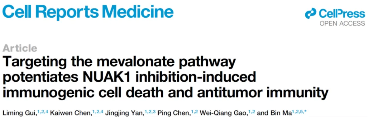 2025年1月16日,素人无码 马斌团队在Cell Reports Medicine期刊上发表文章Targeting the mevalonate pathway potentiates NUAK1 inhibition-induced immunogenic cell death and antitumor immunity。该研究发现激酶NUAK1的抑制能诱导肿瘤ICD,但存在胆固醇代谢的负反馈调控。通过系统性使用他汀类药物(HMGCR抑制剂),可以抑制胆固醇的合成,并改善NUAK1抑制剂诱导肿瘤ICD的效果和增强抗肿瘤免疫。博士研究生桂黎明和陈楷文为该论文的共同第一作者,马斌博士为唯一通讯作者。