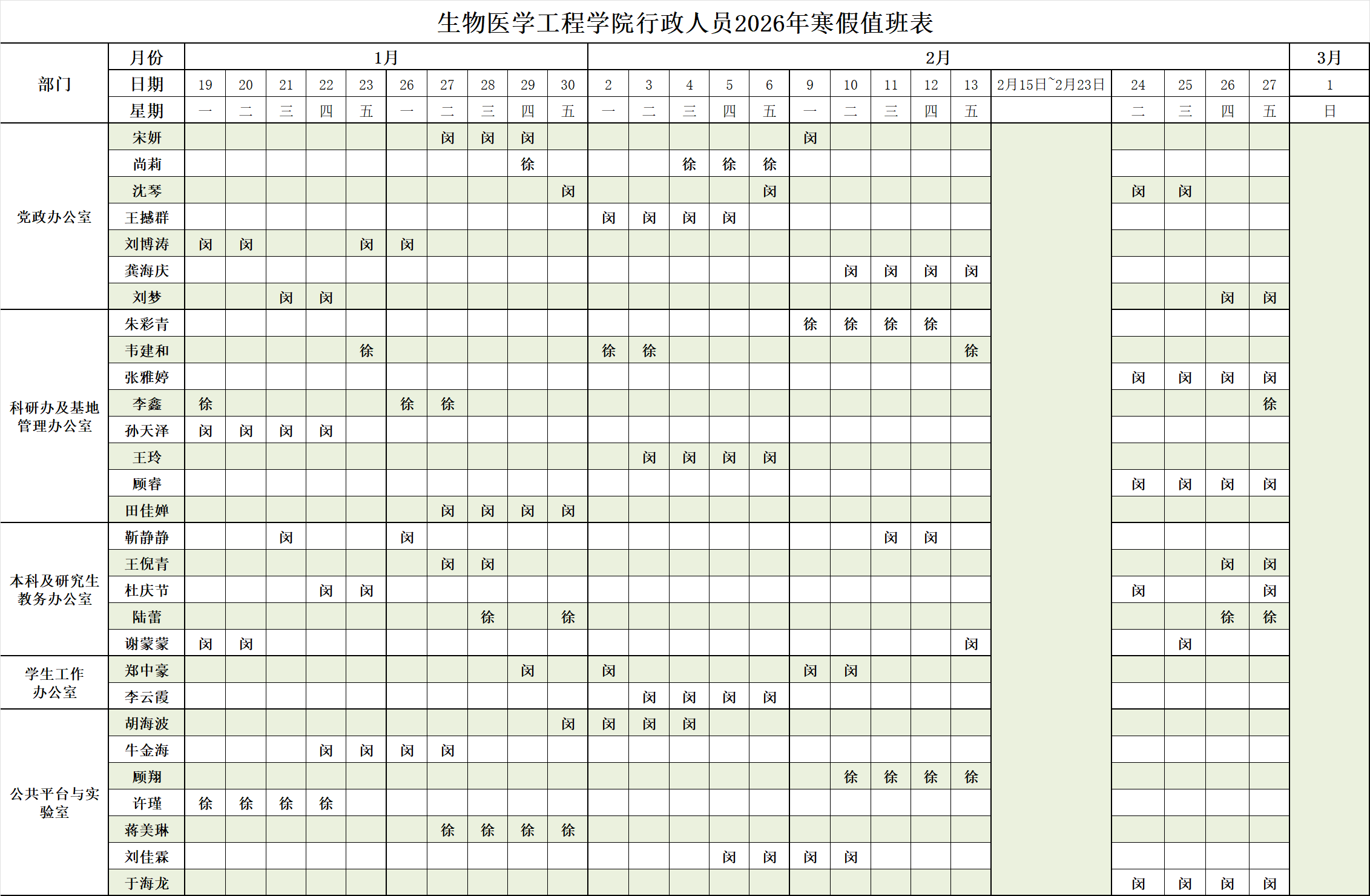 素人无码 行政人员2026年寒假值班表